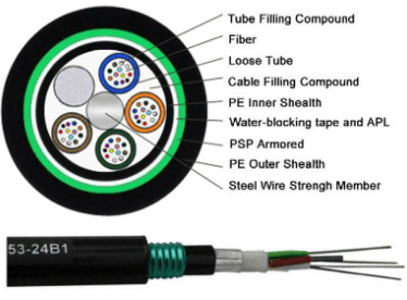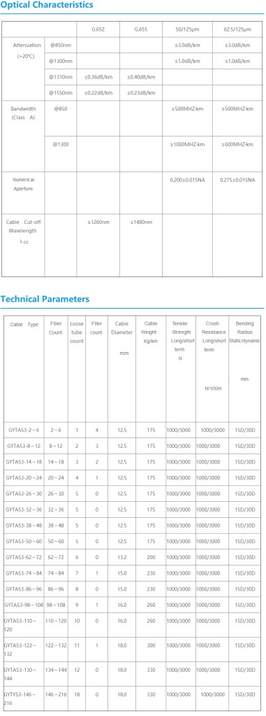 Fiber optic cable GYTA53, 2~432 fibers, central strength member (steel), jelly filled, fiber contained loose tube and PP filler (if necessary) stranded, water blocking jelly, copolymer coated aluminum tape, PE inner sheath, longitudinally covered by copolymer coated steel tape, PE outer sheath.