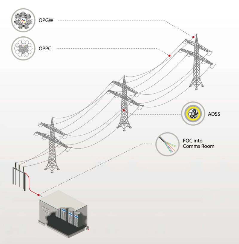 Originally, ADSS cable was developed from a military lightweight rugged deployable (LRD) field cable. With the continuous improvements, it is now used for short span aerial installations—typically on roadside power distribution poles. Since the ADSS cable is non-metallic, it is ideal for applications near high-voltage power distribution lines for which it has become a standard. Using single mode fibers and light wavelengths of either 1310 nm or 1550 nm, circuits up to 100 km long are possible without repeaters. Usually, ADSS was used in 48 and 96 cores. Here is a sketch of a normal ADSS cabling scenario: