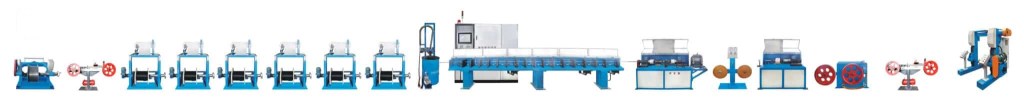 The sheathing normally contains the following components by option: Pay-off with tension dancer, yarn server, Steel tape pay-off, Jib crane, Steel tape Splice table & Welder, Metal tape accumulator, Steel tape corrugation and lubricator, Ripcord pay-off, Steel tape cone forming station, Armor powder application system for cone forming, Water blocking tape pay-off, Dual single head concentric binder, Mylar tape pay-off , Hot melt applicator,.90mm(or 120mm) Extrude, First Water trough, Second water trough, Diameter gauge/ lump detector, Spark tester, Hot stamp printer, Linear Belt Capstan, Cable accumulator, Take-up, Electrical control system (PLC)