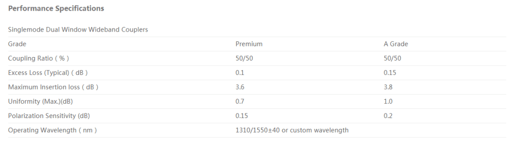 CFO’s Singlemode coupler 1X2 2X2 offer very low insertion loss, low polarization dependence and excellent environmental stability Accurate coupling ratio from 50/50 to 1/99 and fiber type 250um bare fiber, 3mm and 900um loose tube fiber are available with very tight uniformity. Singlemode standard coupler and wideband coupler components find extensive application to perform power splitting and monitoring functions in all kinds of optical communication systems.