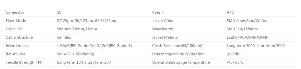 SC APC ARMORED FIBER PATCH CABLE SPECIFICATIONS: