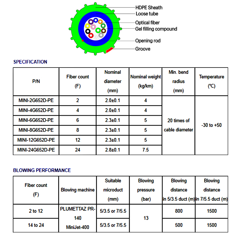 Air Blown Micro Fiber Optical Cable Blown Optical Fiber technology provides flexibility in network design, while anticipating and facilitating future changes as the network evolves . It delivers the best fiber solution for backbone, specialty, Fiber-To-The-Desk (FTTD) and Fiber-To-The-Home (FTTH) applications