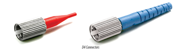 The NEC D4 was probably the first connector to use ceramic or hybrid ceramic/stainless steel ferrules. It uses a smaller ferrule than SCs or FCs.It was widely used in telecom networks in the 80s to early 90s and some may still be in use.D4 connectors are made from a 2.5mm diameter ceramic (zirconia) ferrule for durability. They have a high-performance threading mounting system and a keyed body for repeatability and intermateability. D4 connector is one of the older generation connectors which is keyed, and spring loaded and has a 2mm diameter ferrule. Connector body is nickel plated brass for enhanced durability.