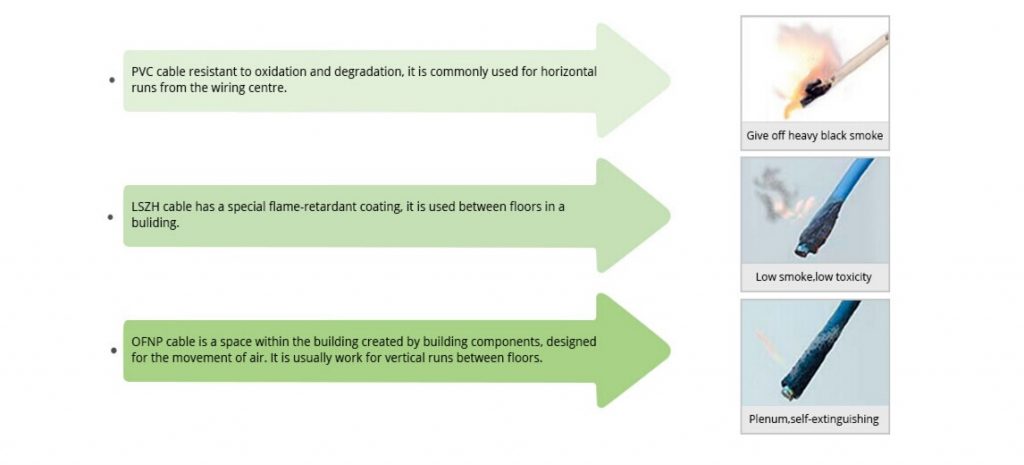 LSZH means Low Smoke Zero Halogen. It’s more rigid as it owns a special flame-retardant coating, and excellent fire safety characteristics of low smoke, low toxicity and low corrosion. LSZH cable is typically used in poorly ventilated areas such as aircraft or rail cars. Low smoke zero halogen is becoming very popular and, in some cases, a requirement where the protection of people and equipment from toxic and corrosive gas is critical.