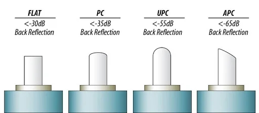 Fiber optic connectors are designed and polished to different shapes to minimize back reflection. This is particularly important in single mode applications. Typical back reflection grades are -30dB, -40dB, -50dB and -60dB. Refer to this connector fiber polish types document for more information.