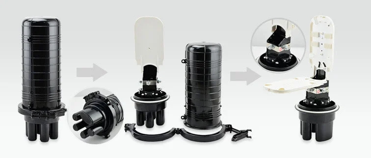 Horizontal type fiber closure has a flat or cylindrical outer housing to provide space and protection for fiber optic splices. It usually contains one or more fiber splice trays assembled to hold/protect optical fiber splices. The common fiber counts of per splice tray are 6, 12 and 24 fibers. So one fiber closure’s splice capacity could cover a range of 6-288Fibers Totally.