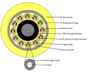 6-8-12-24 Core GJFPV Breakout Tight Buffer Fiber Optic Cable use simplex cable(Φ900µm tight buffer fiber, aramid yarn as strength member) as subunit. A fiber reinforced plastic(FRP) locates in the center of core as a non-metallic strength member.