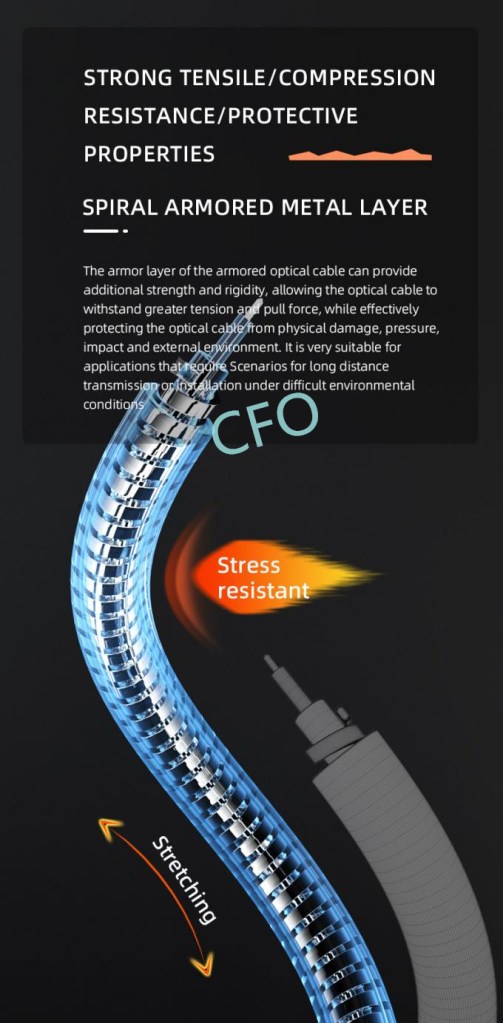 The armor layer of the armored optical cable can provide additional strength and rigidity, allowing the optical cable to withstand greater tension and pull force, while effectively protecting the optical cable from physical damage, pressure, impact and external environment. It is very suitable for applications that require Scenarios for long distance transmission or installation under difficult environmental conditions