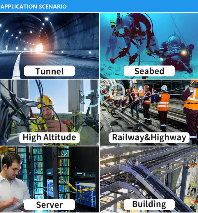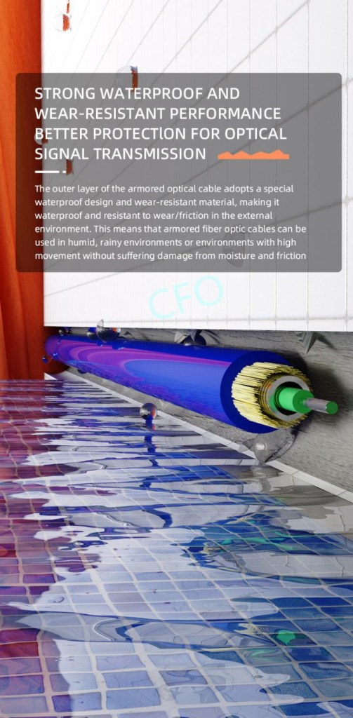 The outer layer of the armored optical cable adopts a special waterproof design and wear-resistant material, making it waterproof and resistant to wear/friction in the external environment. This means that armored fiber optic cables can be used in humid, rainy environments or environments with high movement without suffering damage from moisture and friction